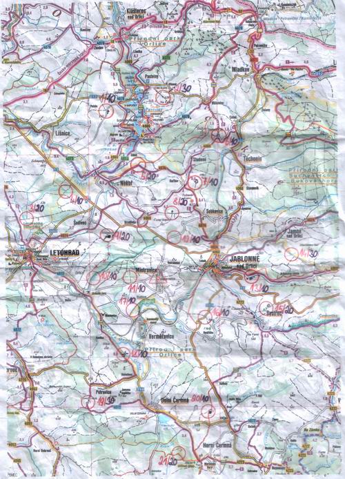 A kde že všude jsme se to vlastně toulali? Červené kroužky představují kontroly a modrá čísla vedle nich bodové ohodnocení. Jen tu nejoptimálnějsí spojnici mezi kroužky si musel vymyslet každý sám :)