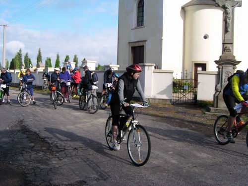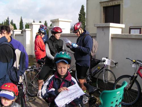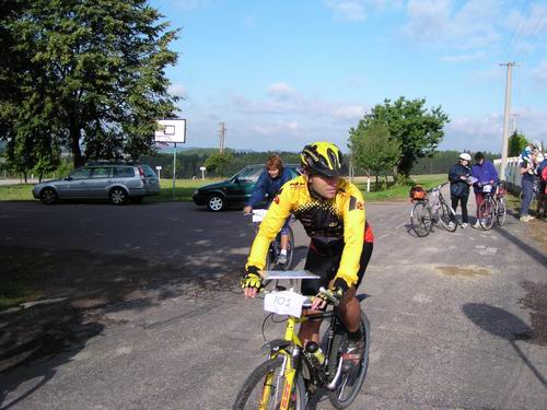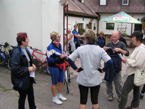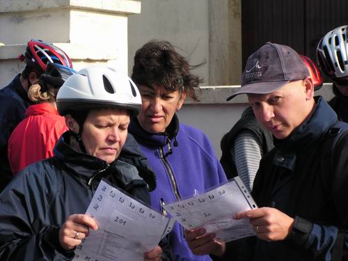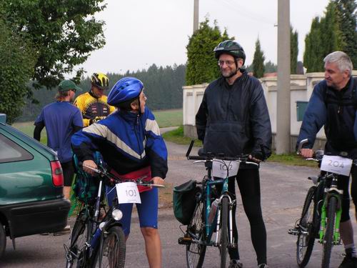 Ve dvoře restaurace U Novotnů jsme vyfasovali startovní čísla (na nás vyšla 203ka), museli si vymyslet jméno týmu (Tlapa Bikers - to zní velkolepě, no ne?) a byl nám přidělen "výkonnostní index". To aby byl závod fér, po závodě se jím násobil nasbíraný počet bodů. My jsme obdrželi index 1.3. Tím nás pan doktor Šrámek "degradoval" mezi smíšené (manželské :) dvojice typu Máslo obecné, díky čemuž jsme neskončili celkově poslední :)