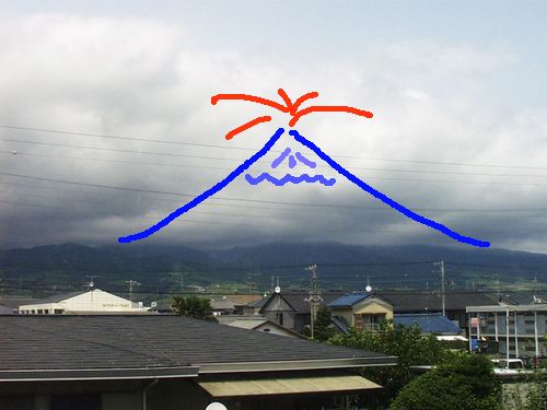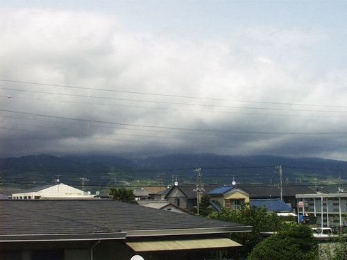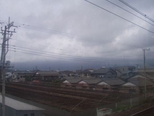 Ale jako vždy, skutečnost bývá poněkud jiná. Hora Fuji na cestě z Funehiki do Kyota. Nutno podotknout, že nebylo vůbec jednoduché tuto kupu mraků vyfotit, neboť přes všudypřítomné baráky nebylo z vlaku vidět dál než 10 metrů.