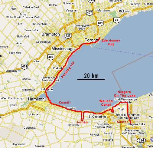 Ale zpět k naemu výletu. Niagárské vodopády se nacházejí přiblině 130 kilometrů autem po dálnici od Toronta. Vzdunou čarou je to tak 50 kiláků, jeliko je ale mezi Torontem a Niagárama kapánek mokřej (tj. jezero Ontario), je nutno jet nejdříve na jihozápad do Hamiltonu a poté to stočit zpět na východ k hranici s USA. Chválil jsem torontské cyklostezky a budu chválit i dál. A to proto, e z Toronta a na samotné Niagáry vede Waterfront Trail, co je cyklotrasa, táhnoucí se po větinu času po pobřeí jezera, protínající pláe, parky plné zeleně, lemující větí či mení útesy a obsahující bezpočet moností kochat se pohledem na jezero, na horizontu se tetelící vzdálené břehy, fluorescentní florou a fajnou faunou v parcích i mimo ně. Tak. To abyste neřekli, e pořád jenom nadávám... :-) Jeliko je Ontario (stát) placaté prakticky stejně jako Ontario (jezero), můete se spolehnout, e jízda na kole vás zde neunaví více ne je nezbytně nutné. Pak u vás ani moc nepřekvapí, kdy vám budou vichni sdělovat, jaká výzva vás čeká na přítích dvaceti kilometrech, protoe se tam vyskytují dvě dvousetmetrová stoupání, které nejsou horí ne vyjet ze Staráku na Terasu (pro mimotřinecké: z podbaby na dejvický kulaák).