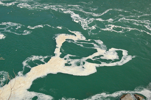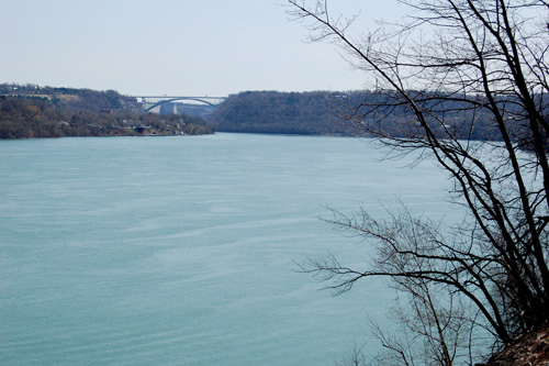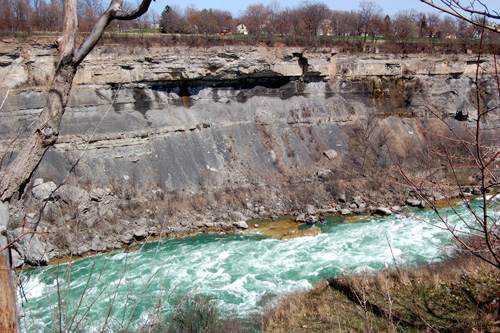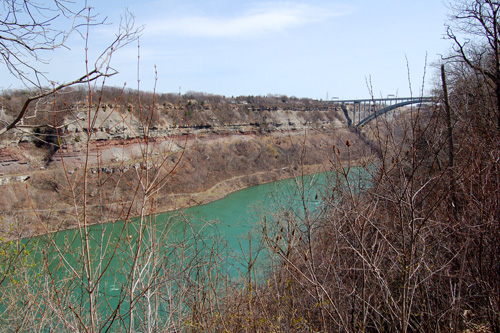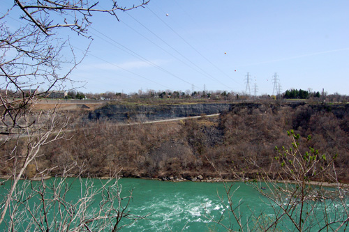 Vydáváme se na jih proti proudu řeky Niagary a ta pod náma začíná pomalinku klesat ní a ní, to aby ty vodopády měly z čeho padat, to dá rozum! Na pozadí most s hraničním přechodem do USA a za ním velká vodní elektrárna.