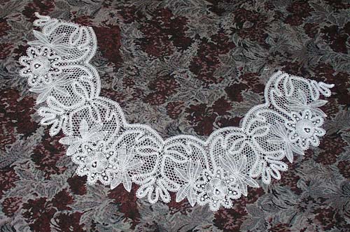 Tato nedokončená krajka je okolek k ubrusu. Vzor byl namalován na tzv. prešpán, jenž byl nalezen na faře v Kunvaldu. Krajka je velmi pracná a bezesporu patří ke skvostným dílům našich babiček. Skládá se z 8 částí.