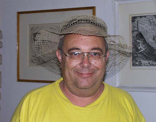 Tatínek s nejnovějším výkřikem klouboučnické módy na hlavě.