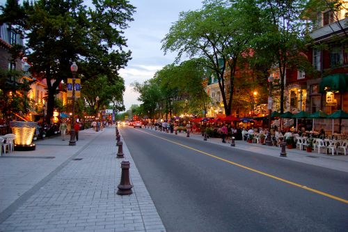 Quebecky raj labuzniku. Dlouha ulice plna restauraci, jedna pekne vedle druhe.