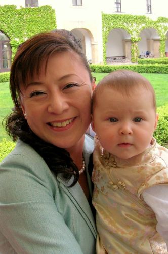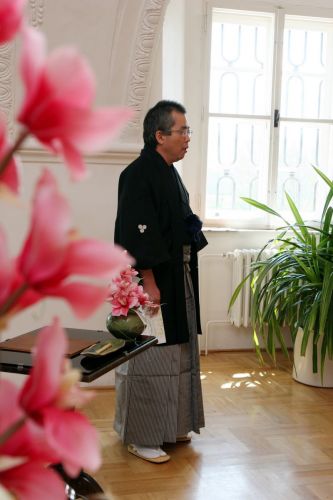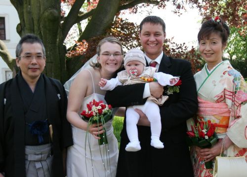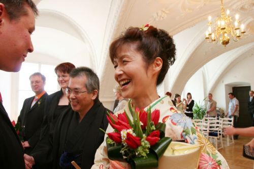 Pozvání přijali i někteří naši zahraniční přátelé. Zejména nevěstini "japonští rodiče" byli pro mnohé atrakcí a to hlavně proto, že se oblékli do slavnostního kimona 着物 a hakami 袴. Japonský tatínek si pro nás připravil překvapení v podobě gratulace písní Utai 謡 přímo během obřadu na Zámku.
